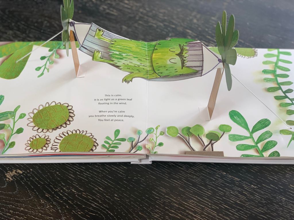 We have a wonderful pop-up children’s book about emotions called, “The Color Monster”, by Anna Llenas. Whenever I read it with my 5-year-old she will say, “Mommy’s favorite page is green, for calm!” and she is absolutely correct. Here’s that page, it even has a little green hammock to remind me of all the rest I’m not getting: